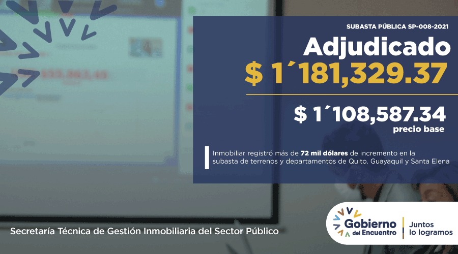 El undécimo proceso de venta de bienes, en el 2021, de la Secretaría Técnica de Gestión Inmobiliaria del Sector Público (Inmobiliar) se cumplió exitosamente. La Subasta Pública Ascendente SP-008-2021 adjudicó 15 bienes inmuebles en cuatro ventas. El monto total de la subasta ascendió a USD 1’181.329,37 en beneficio del país.