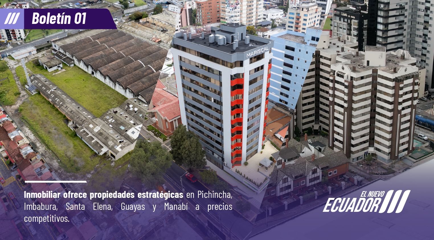 La Secretaría Técnica de Gestión Inmobiliaria del Sector Público (Inmobiliar) anuncia nuevas oportunidades de inversión en las ciudades de Quito, Ibarra, Manta, Santa Elena, Salinas, La Libertad, y Samborondón, con 103 propiedades disponibles, que destacan por su ubicación estratégica y precios competitivos.